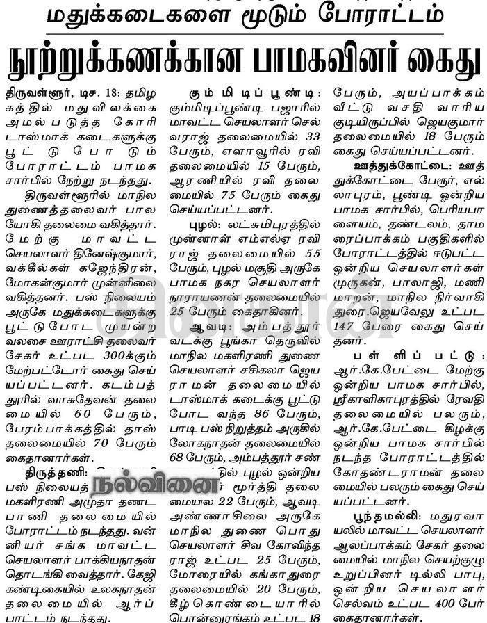 17.12.2012 அன்று விடிந்ததும் நம் பாட்டாளி சொந்தங்கள் அலைகடெலென மதுக்கடைகளுக்கு பூட்டு போட தயரவதை அறிந்த உளவுத்துறை பொய்யன தகவலை மக்களிடம் பரப்பியது. போரட்டத்தில் கலந்து கொள்பவர்களை 15 நாட்கள் பிணையில் வர முடியாதபடி சிறையில் அடைக்கபடும் என கூறியது..